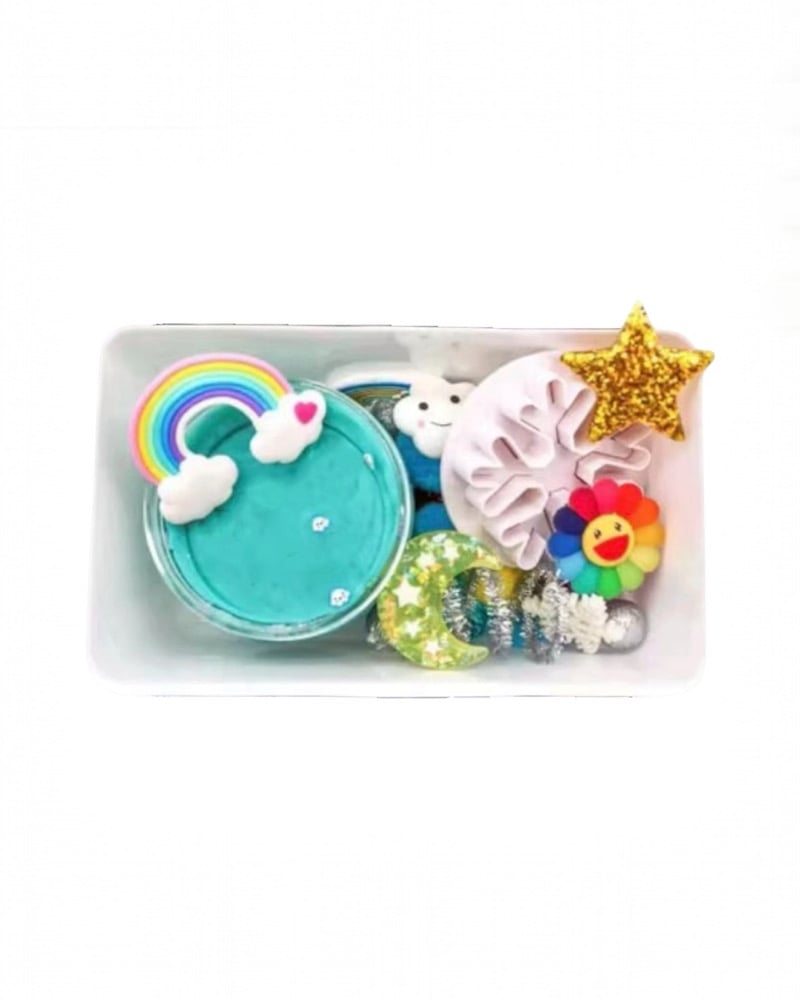 Play Dough Sky-Themed Mini Kit includes soft aqua play dough, along with a moon, sun, rainbow, and sky-themed accessories. It also comes with plenty of magical little gems—perfectly sized for little hands to explore, create, and imagine.